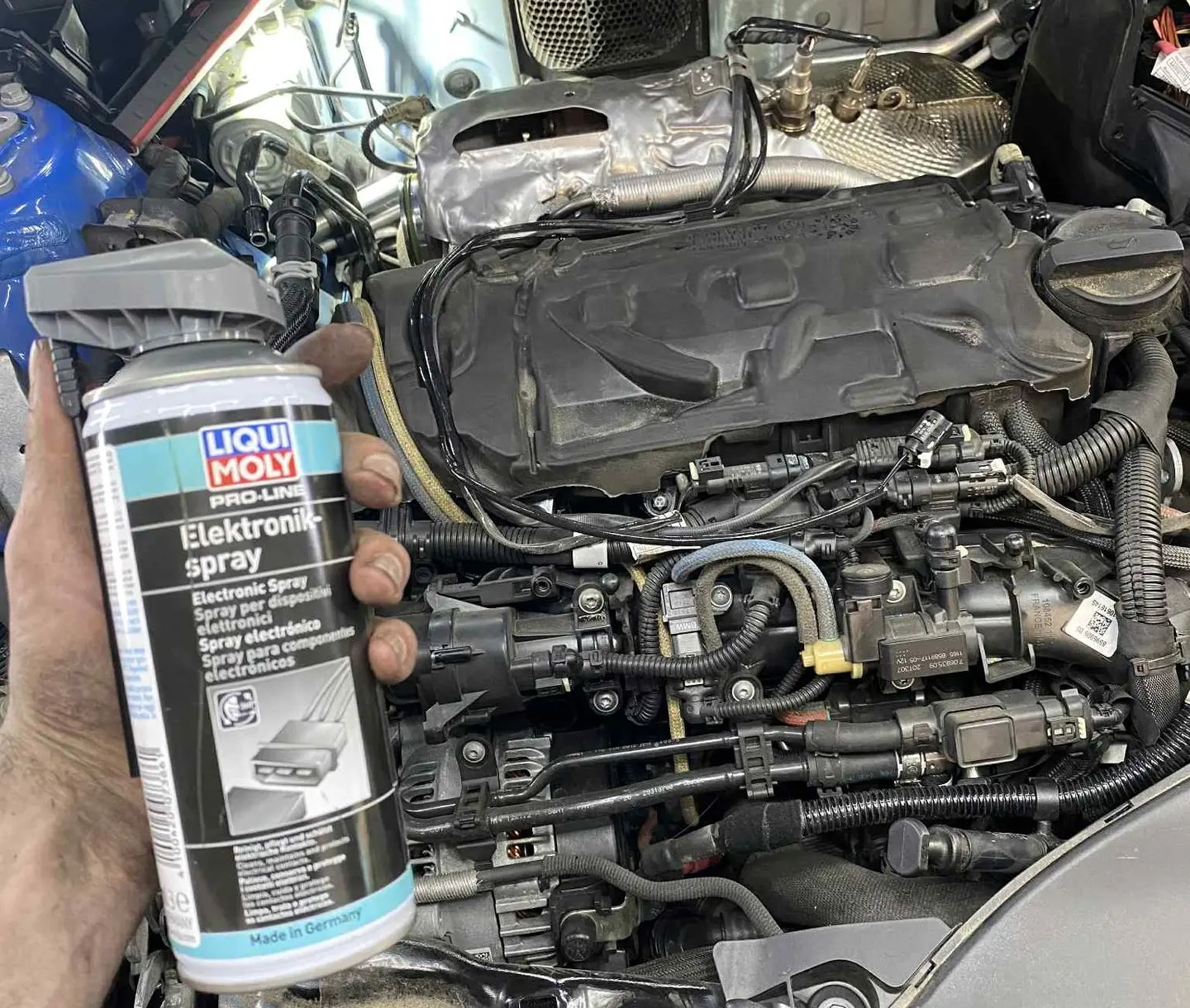 Nadat we de sensor hebben vervangen kunnen we alles terug beginnen monteren. Maar voor de zekerheid en aangezien we toch al bezig zijn. Spuiten we nog wat elektronica spray in de connectoren van de temperatuur sensoren.